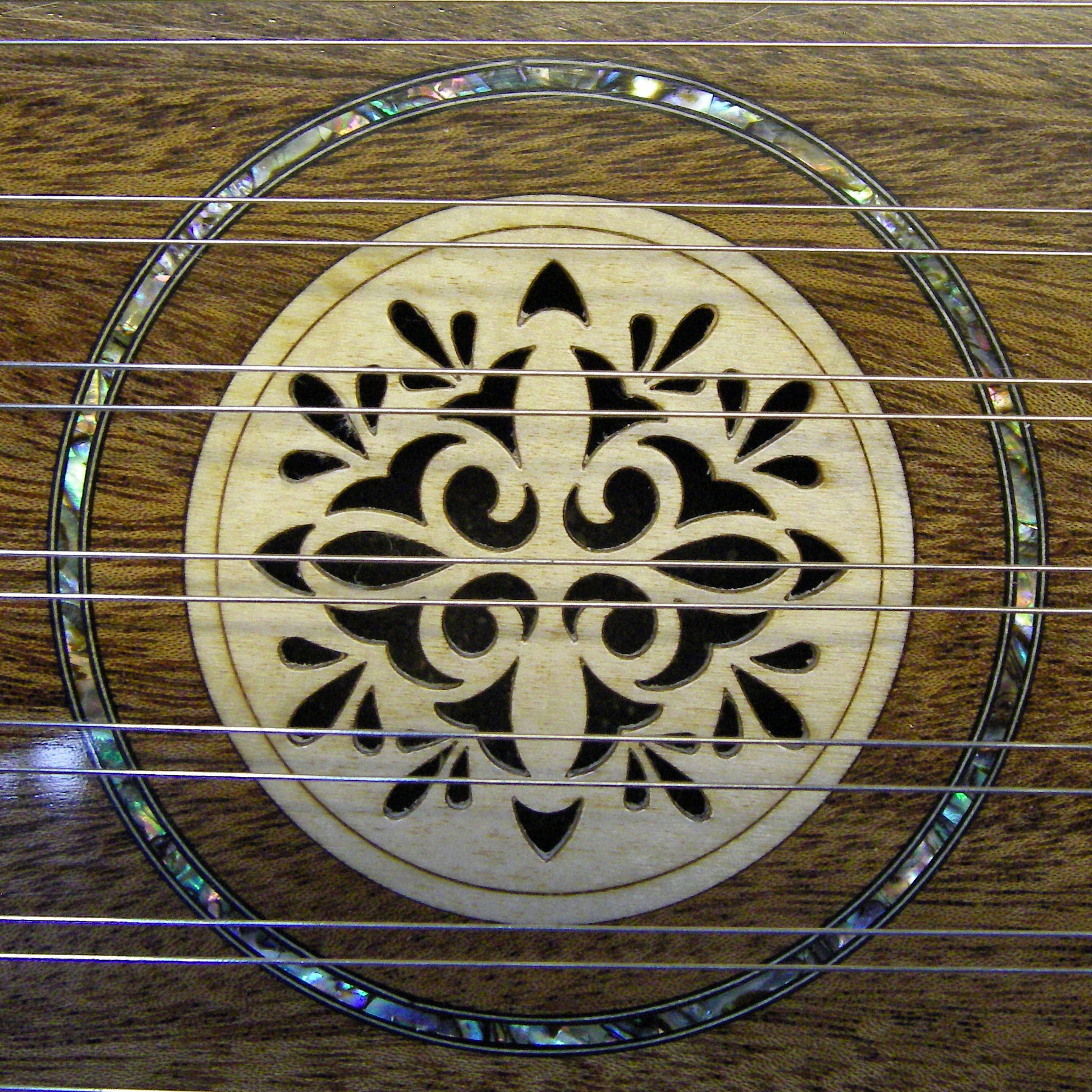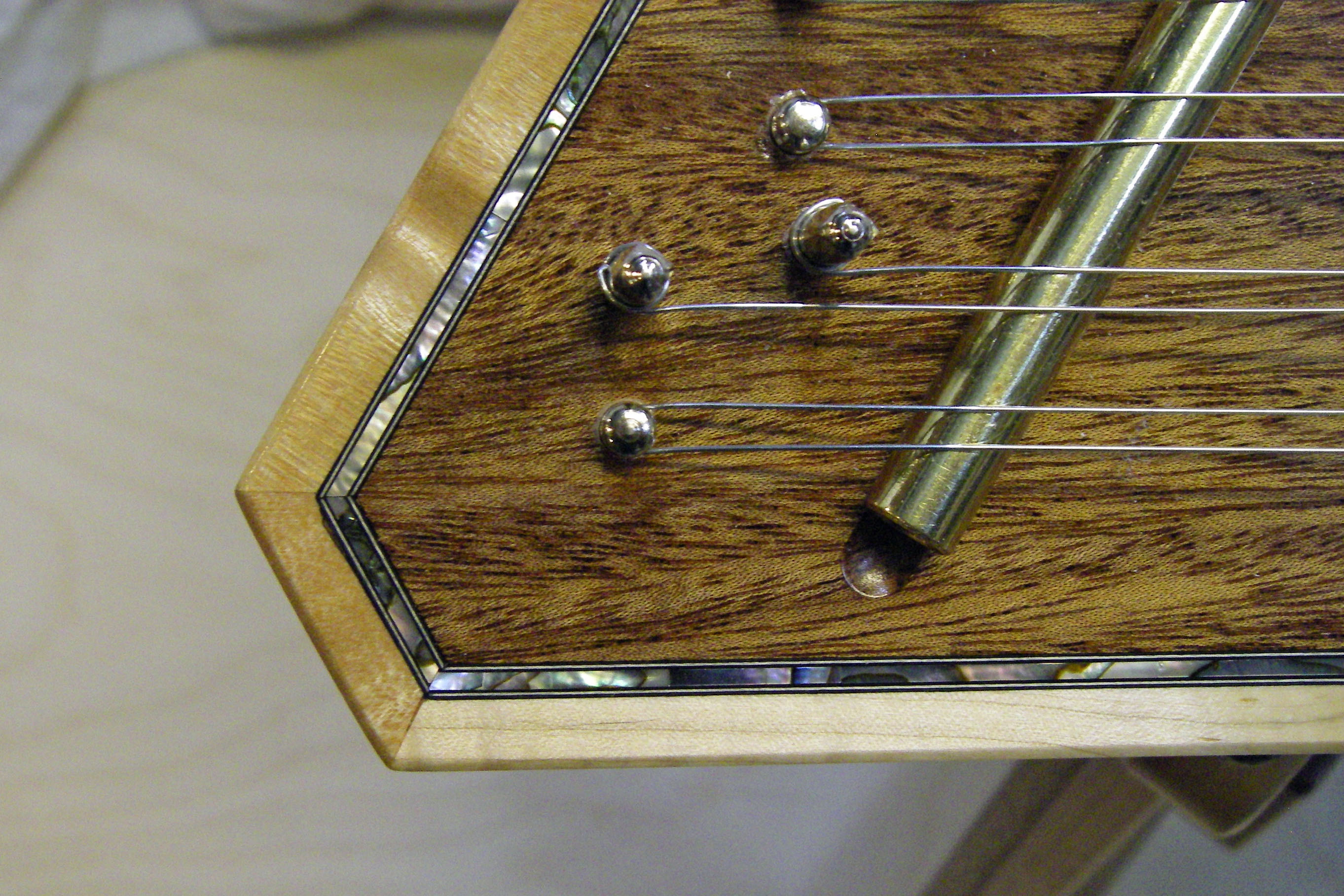 Abalone Shell And Black and White Banding Inlayed Around The Primeter Of The Dulcimer.